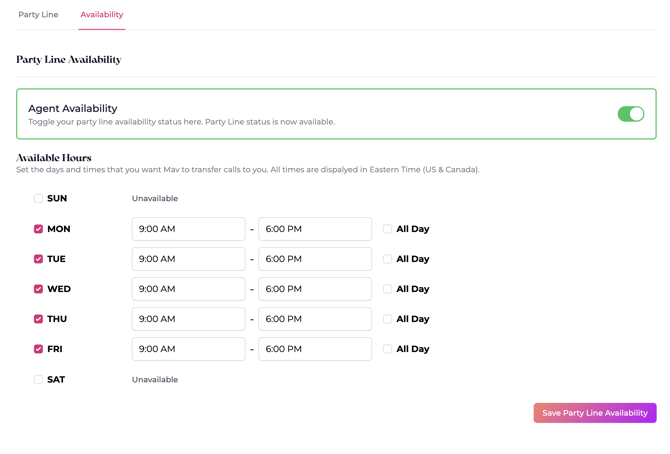 Head over to the Party Line section inside the Mav dashboard and then click on "Availability." Once inside, you'll see a screen like the following: